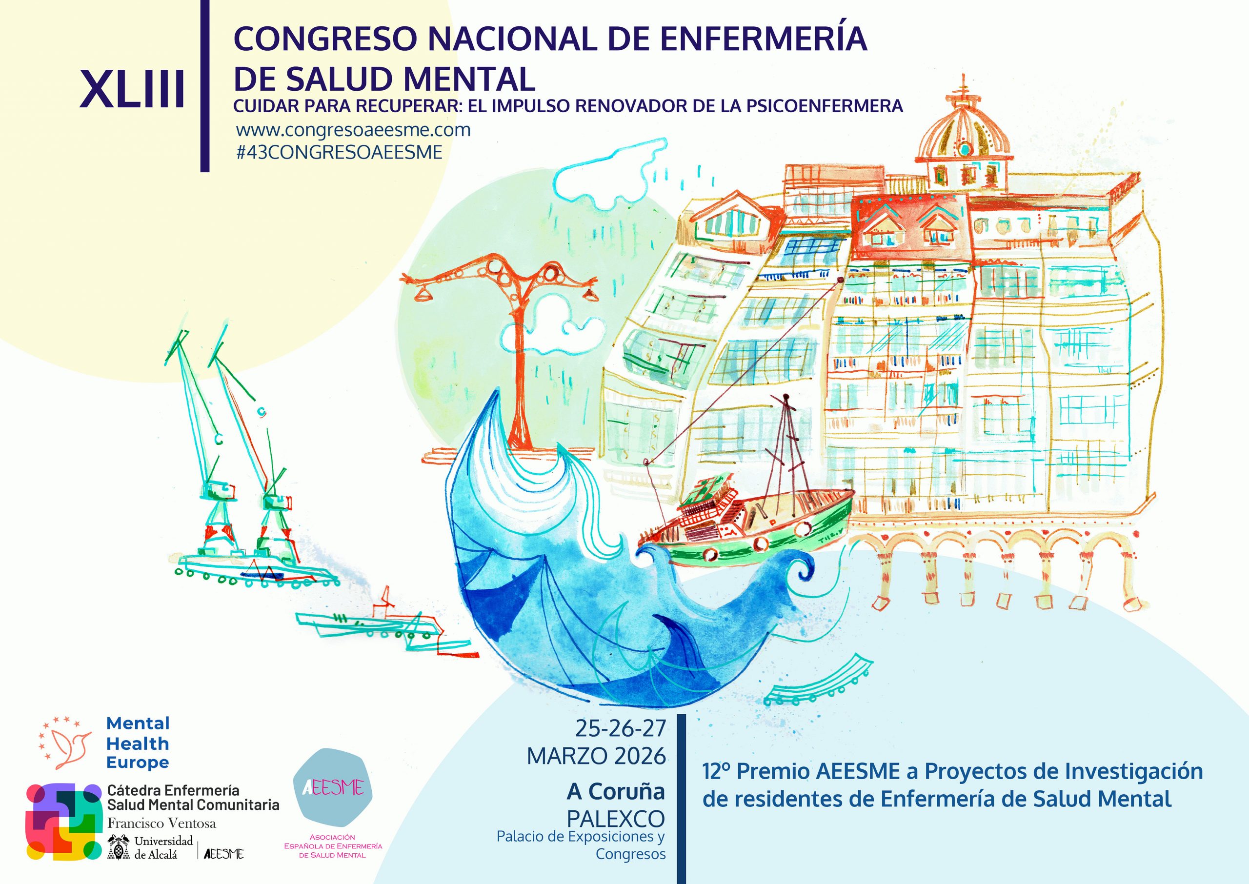 Anunciamos la apertura de la web del XLIII Congreso Nacional de Enfermería de Salud Mental para inscripciones y envío de trabajos científicos, lo que significa que puedes registrarte, subir tu resumen de póster o comunicación oral siguiendo sus normas específicas. El Palacio de Exposiciones y Congresos PALEXCO en A Coruña se convertirá durante los días 25,26 y 27 de marzo de 2026 en el epicentro de los debates sobre innovación, liderazgo, ciencia y el futuro de los cuidados enfermeros en salud mental.